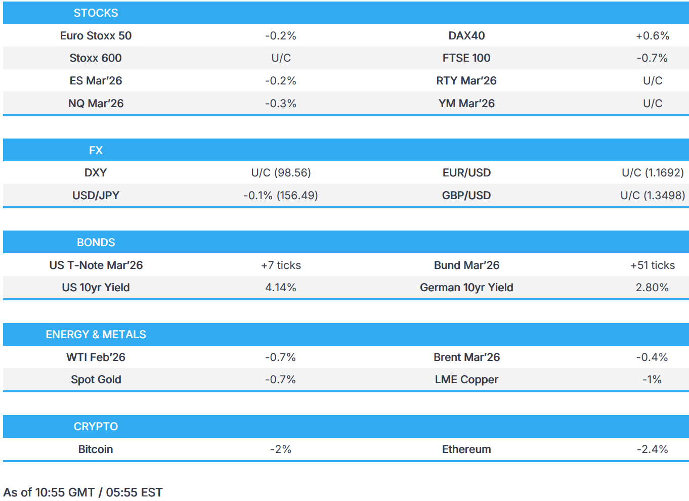 - US equity futures are mixed/lower (ES -0.2%, NQ -0.3%, RTY U/C), with the RTY holding mildly in the green whilst the ES and NQ are posting slight losses.